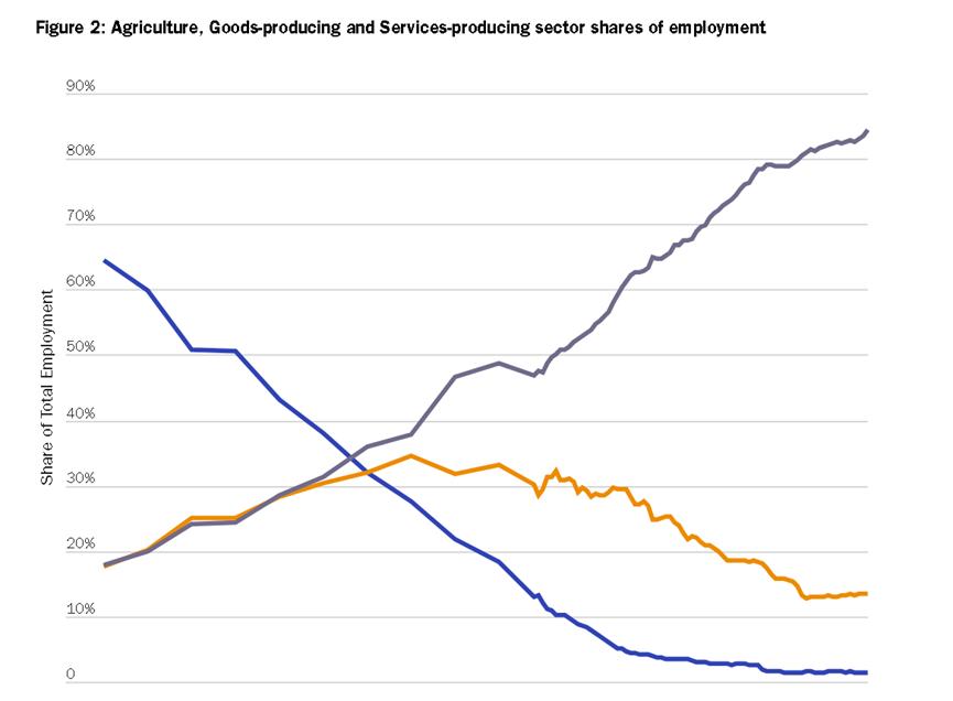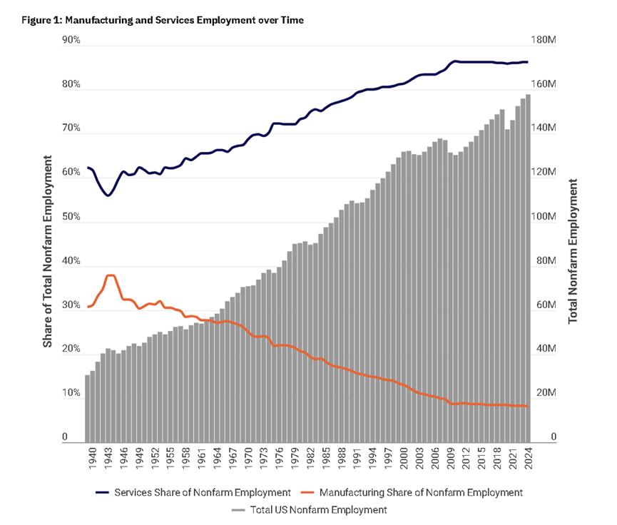 两位学者拿出的一张直观的图表就显示,早在1940年时,制造业岗位在美国所有非农业岗位中的占比就已经相当低了,为 30% 左右,而服务业则为60%。之后,自20世纪60年代起,美国制造业的岗位一路下滑,而美国服务业的就业岗位则在同期迎来了显著增加。到了2024年时,美国的劳动力市场不仅拥有了数倍于20世纪60年代的就业规模,而且这些岗位有超过80%都是服务业提供的。
