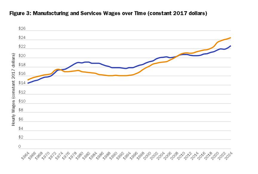 更重要的是,两位学者指出,在制造业岗位持续减少的这段期间,美国人的收入并没有变差,而是因为服务业岗位的大增而出现了强有力的增长。美国的国力也在这一期间得到了进一步的增强。两人拿出的另一张图表也显示,在过去10多年里,美国服务业提供的时薪已经超过了制造业,且拉开了距离。