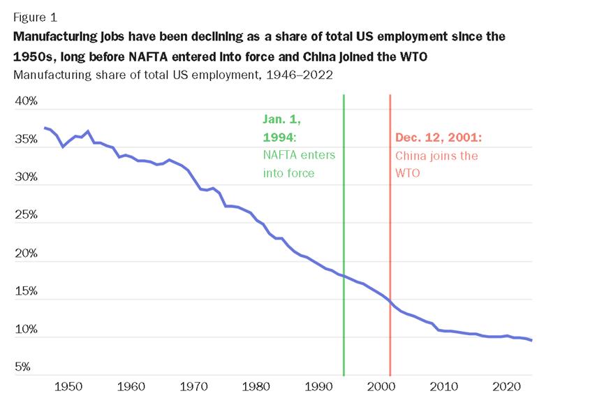 此前,美国加州大学圣地亚哥分校的经济学教授凯尔·汉德利(Kyle Handley)亦曾在一篇发表在卡托研究所的文章中表示,美国制造业岗位的减少与白宫及其支持者一直在炒作的中国加入世贸组织无关,因为这一趋势自20世纪50年就已经开始了。而且,汉德利同样认为美国制造业岗位的减少是科技进步以及自动化的结果。