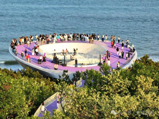 滩涂间热闹非凡,观景栈道上摩肩接踵,游客们争相定格海天一线的美景,假日氛围拉满整片海岸。S