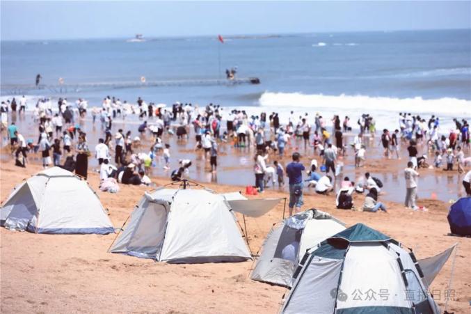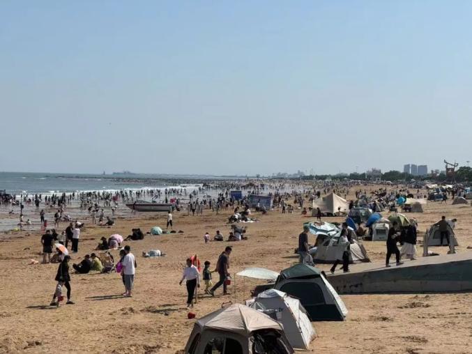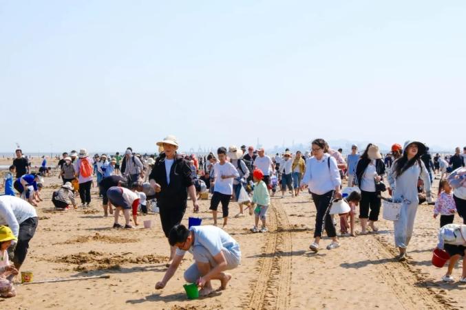 多岛海风景区的沙滩上,男女老少拎着水桶埋头寻宝。