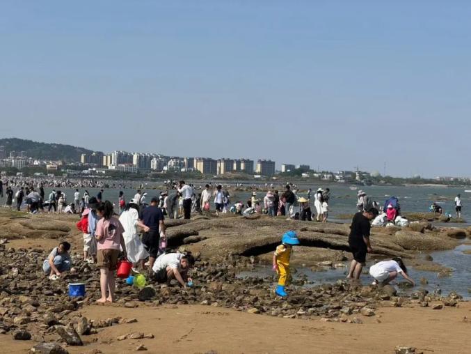 赶海区成了欢乐的海洋,潮水退去,礁石滩涂间满是拎桶拾贝的游客。海岸边处处欢声笑语,假日氛围被彻底拉满,令人沉醉。