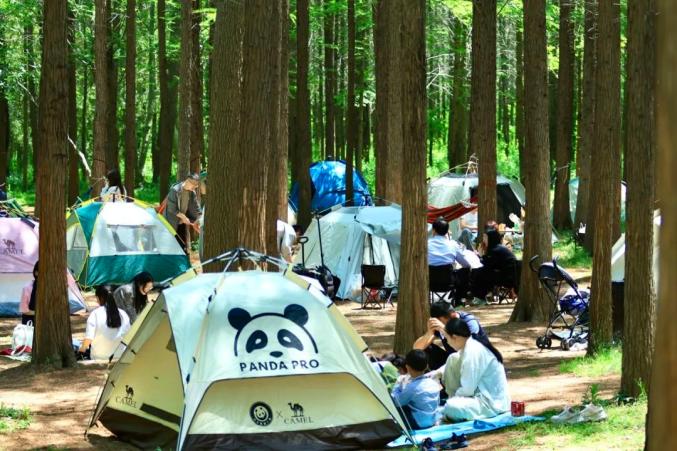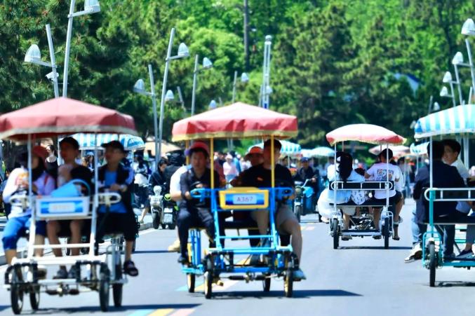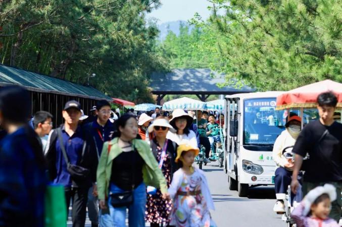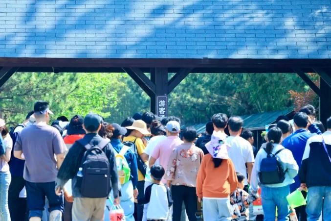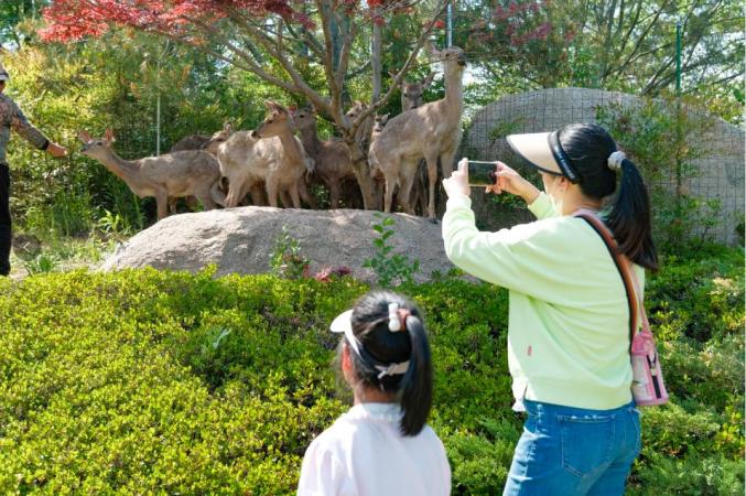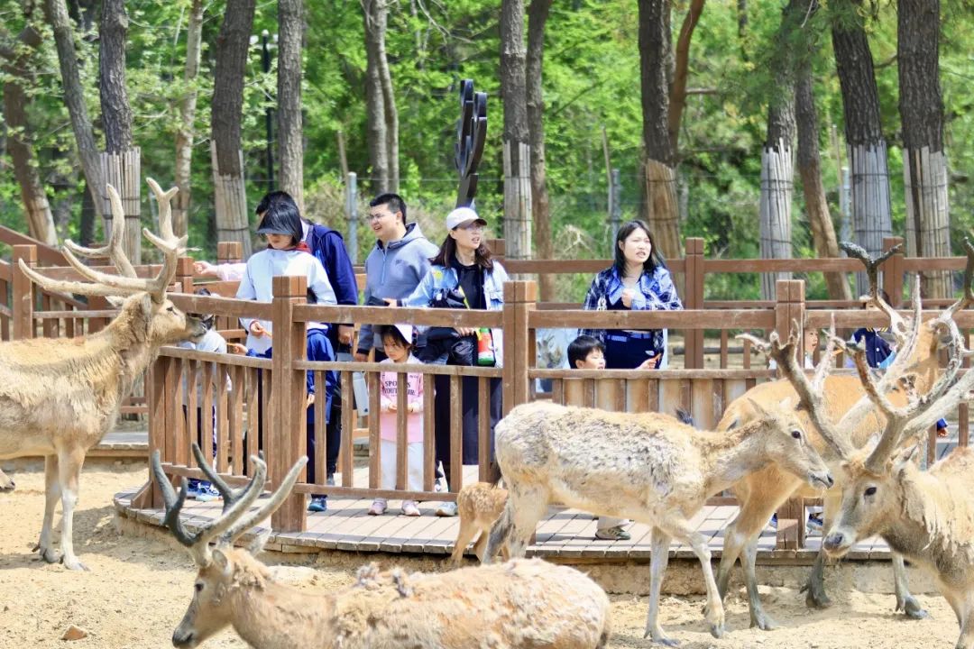 小火车车厢内“人挤人”,站台排起长龙,水杉林下帐篷“铺天盖地”,骑行道“车流如织”。森林里还有一群可爱温顺的麋鹿,游客们举着胡萝卜与它们互动并合影留念。S