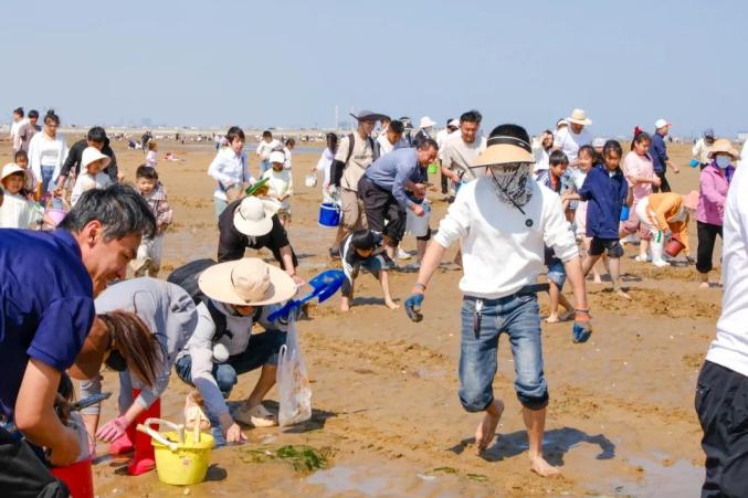 随着潮水退去,市民游客们纷纷拿着工具,迫不及待地走向滩涂。滩涂上,到处都是忙碌的身影,大家弯着腰,仔细地寻找着藏在泥沙中的小螃蟹、蛤蜊、蛏子等小生物。
