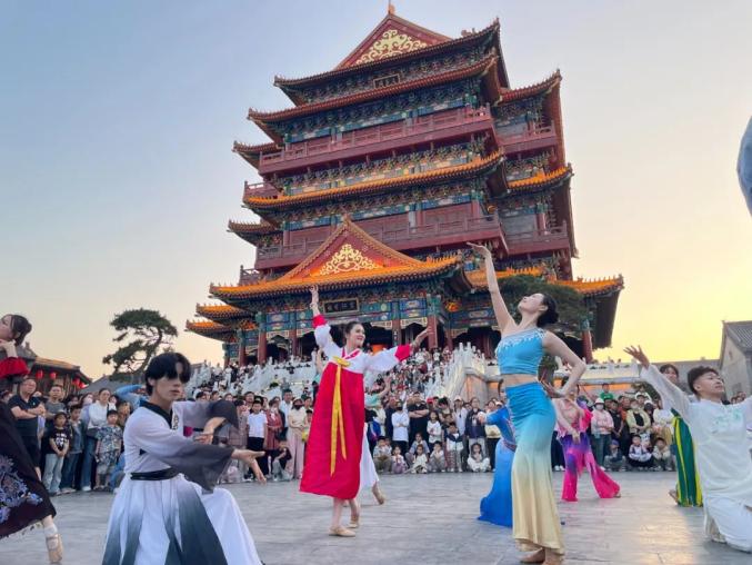 莒国古城五一期间舞蹈快闪节目,惊喜互动不停歇。广袖翻飞间,彩带破空划出绚丽弧线,衣袂飘飘似流云追月,每一个转身、每一次回眸,都带着穿越千年的韵味。
