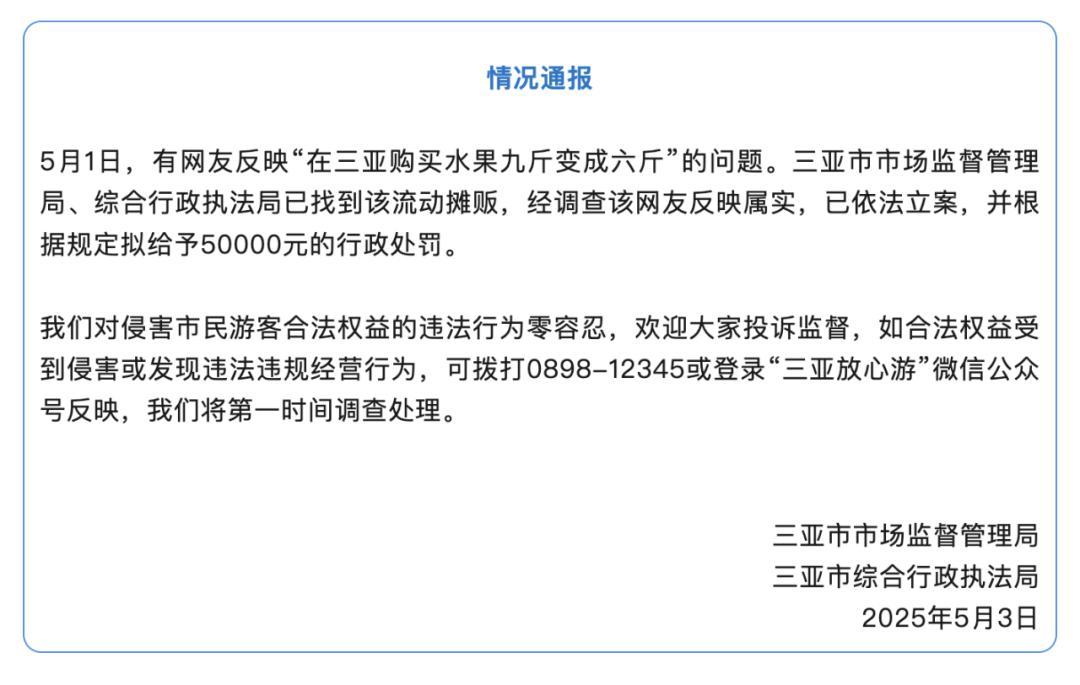 海南省三亚市市场监督管理局、三亚市综合行政执法局5月3日发布情况通报:5月1日,有网友反映“在三亚购买水果九斤变成六斤”的问题。三亚市市场监督管理局、综合行政执法局已找到该流动摊贩,经调查该网友反映属实,已依法立案,并根据规定拟给予50000元的行政处罚。