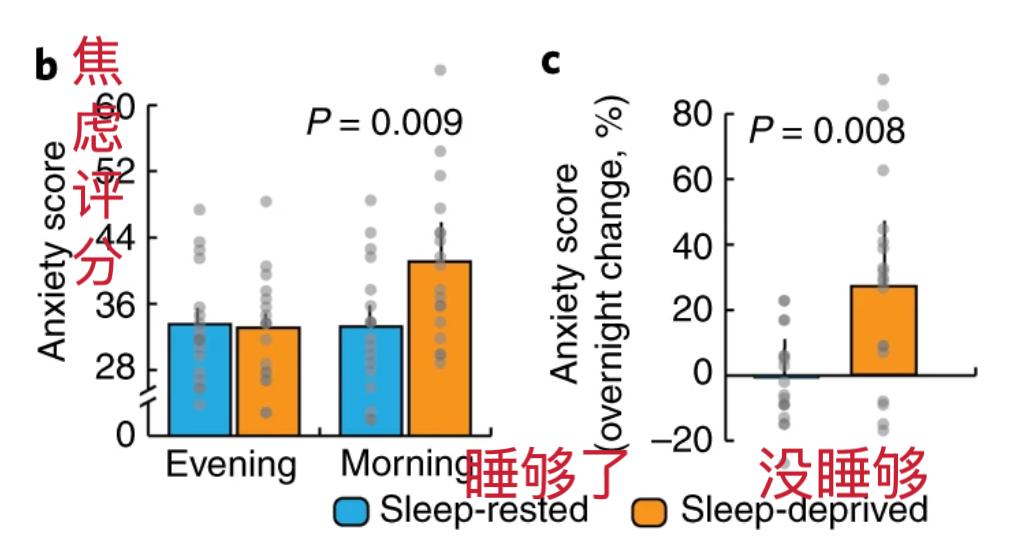 一晚上的睡眠剥夺,会让健康的成年人焦虑水平上升 27%,一半的参与者甚至超过了焦虑症状的临床诊断标准。
