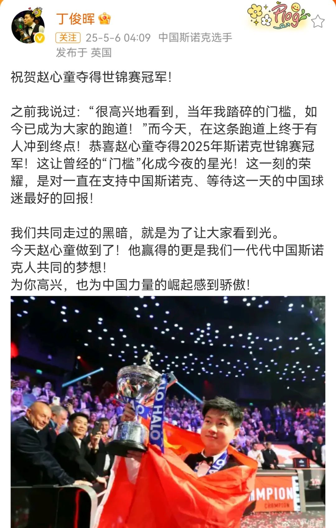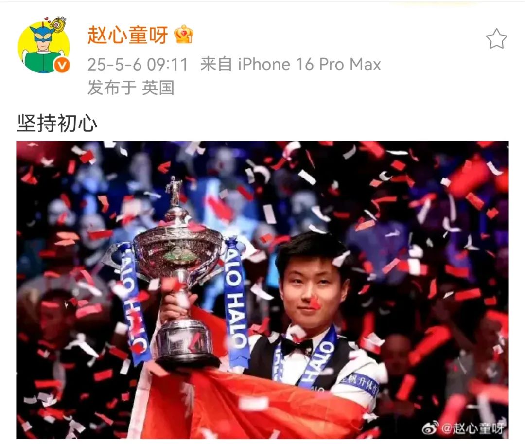 赵心童微博截图丁俊晖发文祝贺: