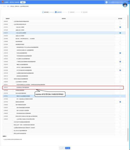 3.进入“表单选择页面”,勾选《A107012研发费用加计扣除优惠明细表》,点击【下一步】。