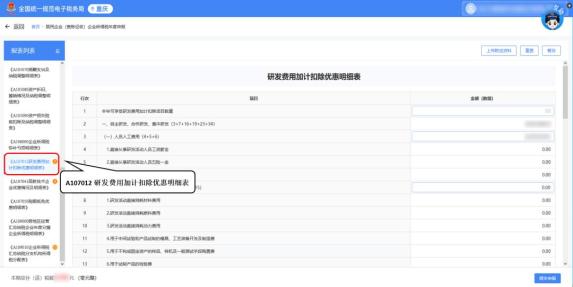 4.在“报表列表”栏点击填写《A107012研发费用加计扣除优惠明细表》,根据研发支出辅助账样式,将全年能够准确归集的研发费用,根据明细选择填报不同行次。