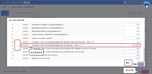6.系统自动跳转出《免税、减计收入及加计扣除》表格,填写25栏“企业开发新技术、新产品、新工艺发生的研究开发费用加计扣除(按100%加计扣除)”,确认无误后点击【确定】,再点击【提交申报】。