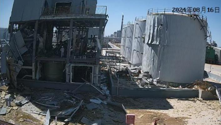 15时44分14秒,康义化学公司次氯酸钠310厂房发生闪爆,闪爆瞬间伴有强烈火焰,浓烟腾空四散,持续时间约1分钟。闪爆产生的冲击波及设备碎片致310厂房一层至四层设备、管线、厂房墙体等受到大面积损坏。
