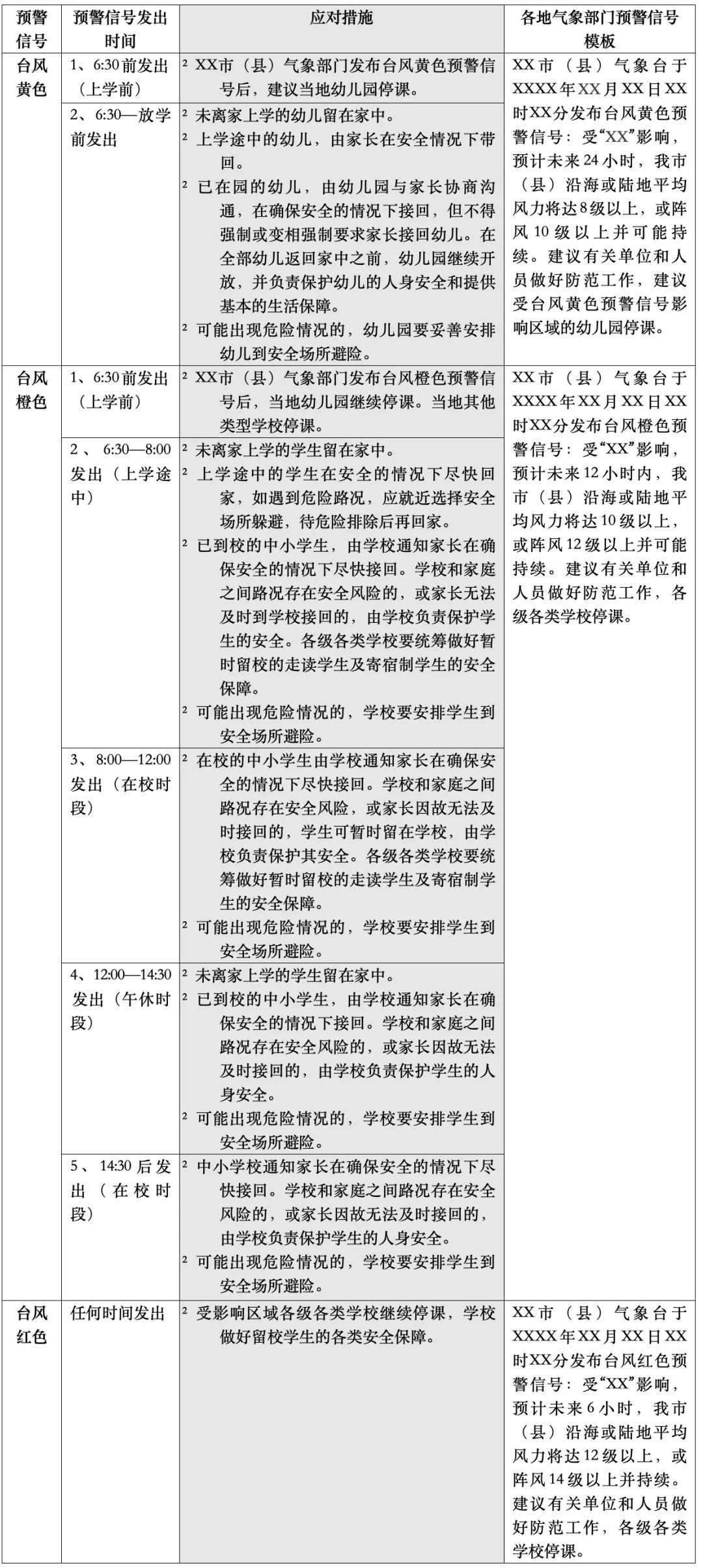 据悉,《指导意见》适用于指导全省各地气象部门发布台风红色、橙色、黄色预警信号,暴雨红色、橙色预警信号(以下统称“台风暴雨预警信号”)两类极端天气对应区域内各级各类学校(含幼儿园)及校外培训机构的停课安排及安全防范工作,但不适用于发布台风暴雨预警信号后的国家和省的统一考试安排。