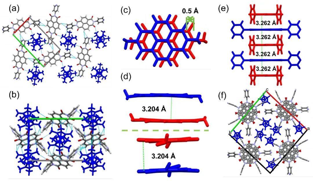本文首先建立了简洁的自由基合成方法:将酰亚胺位不同取代的NDI衍生物与二茂钴(CoCp2)/十甲基二茂钴(CoCp2*)反应,然后通过溶液结晶的方法即可获得一系列NDI阴离子自由基晶体材料。作者发现,取代基和还原剂的类型可以起到显著调整晶体堆积结构的作用。例如,CoCp2*比CoCp2具有更低的电离能和更大的空间位阻,这使得它能够与NDI交替存在,并抑制其π-π堆积,得到单体晶体3b(NDI-Py/CoCp2*)。在还原剂为CoCp2的情况下,当取代基较小为氨基时,NDI自由基可以采取重叠构象堆叠,形成坚固的多中心双电子键,从而生成二聚体晶体2a(NDI-NH2/CoCp2)。通过增加取代基团的体积为吡啶环,空间位阻倾向于使NDI向交错构象堆叠转变,导致电子不再局限于二聚体内,而是离域形成扩展的π-堆叠晶体2b(NDI-Py/CoCp2)。此外,与相应的中性晶体1a(NDI-NH2)和1b(NDI-Py)进行比较,2a和2b的NDI分子间均具有更近的堆积距离和更大的重叠面积,结合理论计算,表明离域π电子间的相互作用表现为强烈的吸引力而非静电斥力。