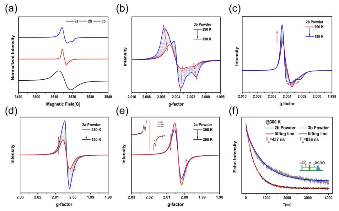 图2. 三种晶体的固态吸收光谱和轨道计算示意图作者进一步通过EPR揭示了三种晶体中不同的自旋相互作用。单体3b的线型表现出明显的非对称各向异性洛伦兹特征,表明其EPR跃迁主要受自旋-晶格相互作用的影响,并伴有寿命展宽。考虑到2a中NDI分子具有类似的对称性,但显示出更宽且更对称的峰,这归因于二聚体内部强烈的自旋偶极-偶极相互作用导致的久期展宽,掩盖了各向异性,使其无法区分。对于3b,其不对称峰形不同于传统的粉末各向异性,但类似于Dysonian线型(A/B=1.5),即传导电子顺磁共振(cEPR),这可能与一维π电子的离域有关。随后的脉冲EPR表征与上述分析一致,3b由于自旋关联较弱表现出最长的相干时间T2,而2b的T2较短。然而,对于2a,二聚体内强自旋-偶极相互作用引起自旋快速退相干,无法观察到回波衰减。