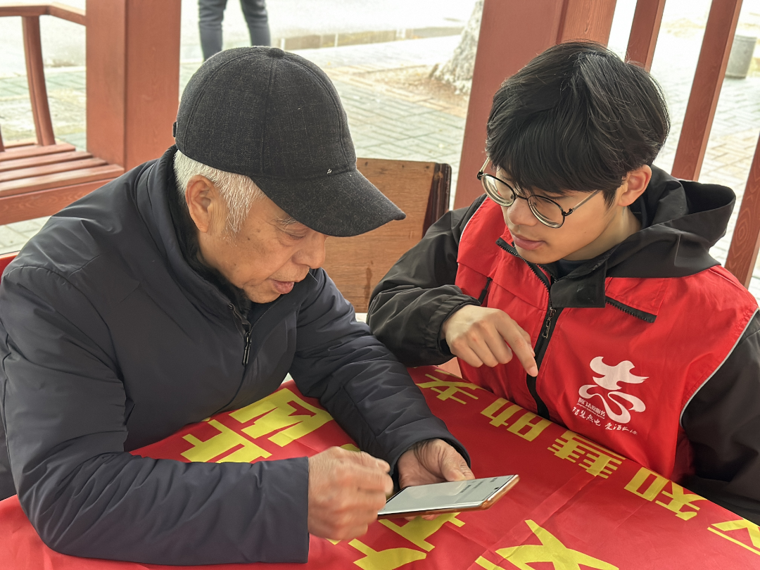 智暖银龄志愿服务队的青年志愿者指导老人使用智能手机