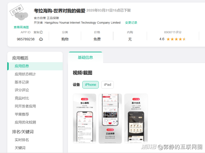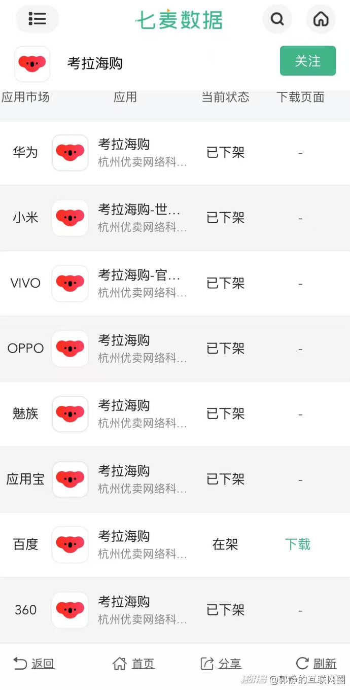 七麦数据显示,“考拉海购”App的iOS版下架时间是2025年3月31日15点,安卓版没有明确下架时间,但在小米应用商店、vivo应用商店、应用宝等平台上,“考拉海购”均处于下架状态。