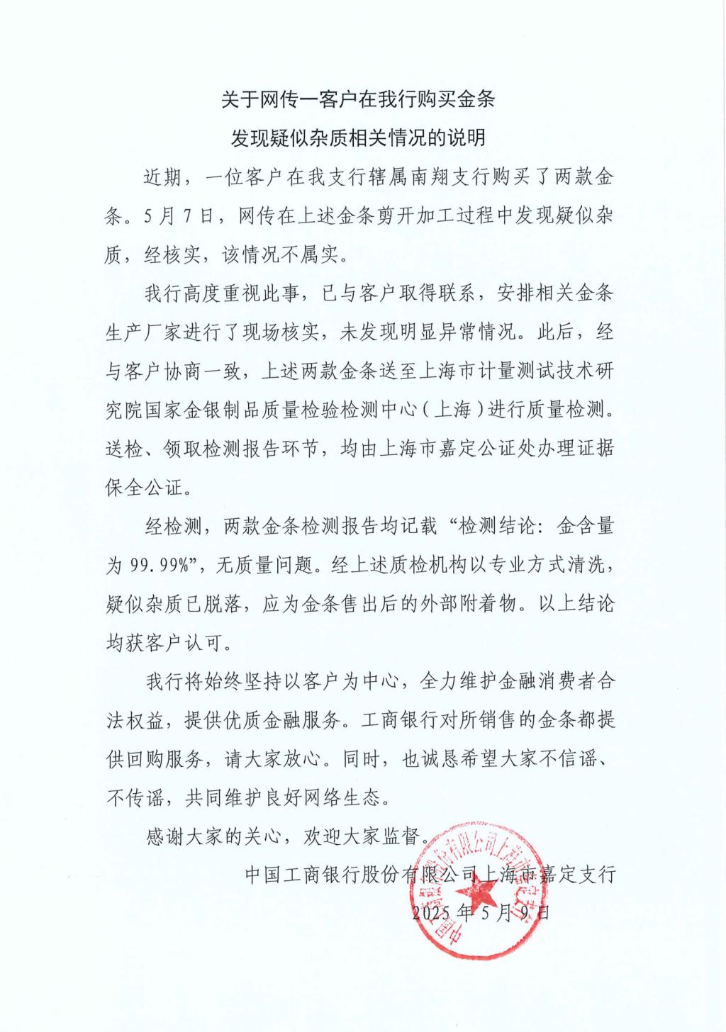 “经检测,两款金条检测报告均记载‘检测结论:金含量为99.99%’,无质量问题。经上述质检机构以专业方式清洗,疑似杂质已脱落,应为金条售出后的外部附着物。以上结论均获客户认可。”工行上海嘉定支行表示。