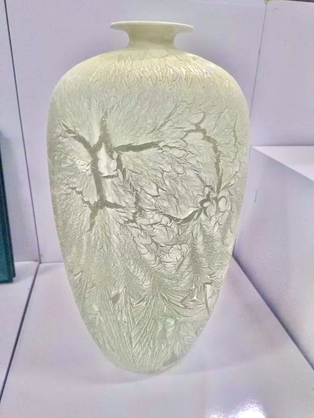 除了烧制冰花瓷的工坊,在这栋大楼里还有一个陈列室,里面陈列着很多优秀的冰花瓷作品。记者走进哈尔滨学院艺术实验中心大楼的这间陈列室时,一件件晶莹剔透的瓷器在灯光下绽放出独特的冰雪霜花纹理……王昌利各个不同时期烧制的冰花瓷作品大都在这里展出,其中最为珍贵的就是今年哈尔滨亚冬会期间赠送给外国贵宾的“国礼”冰花瓷瓶,这里展出的瓷瓶是当时烧制国礼时的同一批产品。