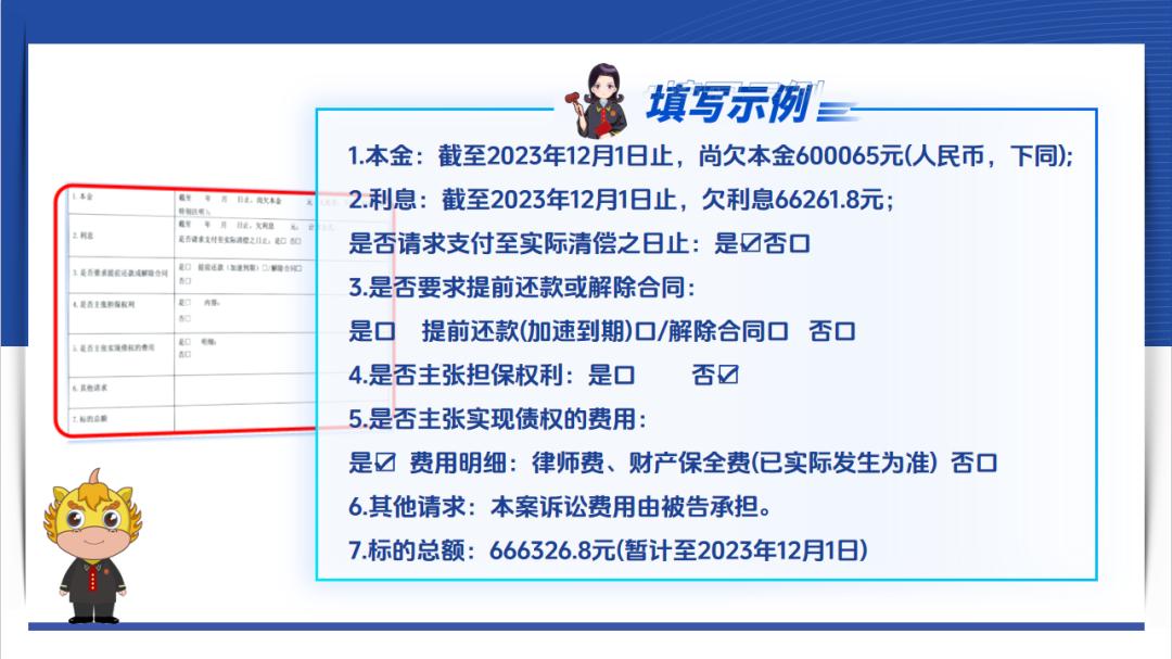 比如,主张利息时,要在第2项中写清楚利息的计算期间、计算方式、利率以及欠付利息的总金额,并勾选是否请求支付至实际清偿之日止。最后,还要将所有诉请金额之和填入第7项“标的总额”中。第三,在填写约定管辖时,一定要根据合同约定的内容如实填写。
