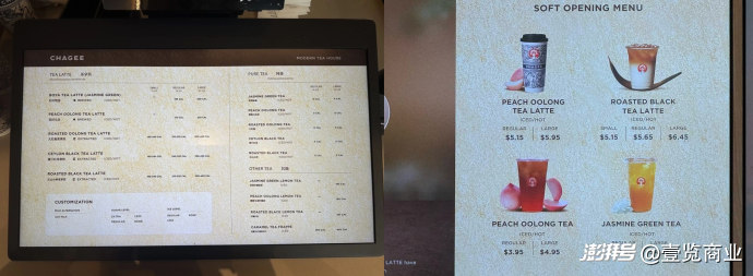 从菜单看,共上线14款饮品,分为茶拿铁、纯茶和其他三大版块。茶拿铁既包括伯牙绝弦、花田乌龙这类大热单品,也包括大红袍茶拿铁、锡兰红茶拿铁、正山小种茶拿铁等现萃茶。价格方面,大杯伯牙绝弦售价5.95美元/杯(约合人民币40元),大杯锡兰红茶拿铁售价6.45美元/杯,大杯蜜桃乌龙、茉莉绿茶4.95美元/杯。