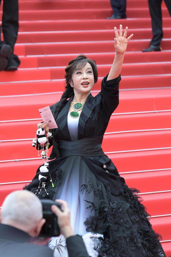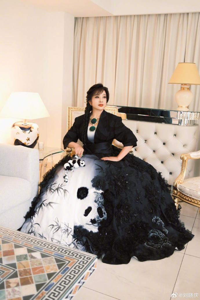 74岁刘晓庆身穿熊猫元素礼裙,搭配一串熊猫玩偶,同时佩戴标志性大翡翠首饰,将中国传统文化元素融入国际舞台。