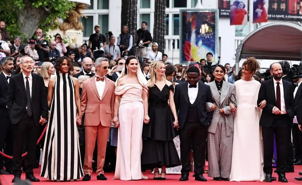 5月13日,在法国戛纳举行的第78届戛纳国际电影节上,主竞赛单元评委会主席朱丽叶·比诺什(前排左四)携众评委亮相开幕式红毯。