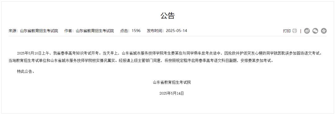 来源:山东省教育招生考试院公告指出,5月10日上午,山东春季高考知识考试开考。当天早上,山东省城市服务技师学院考生姜某在与同学乘车赴考点途中,因抢救并护送突发心梗的同学就医耽误参加首场语文考试。当地教育招生考试单位和山东省城市服务技师学院核实情况属实。