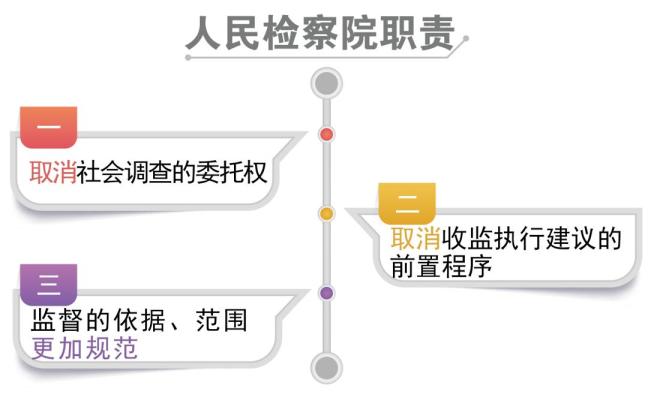 一是取消社会调查的委托权。根据《中华人民共和国社区矫正法》第18条的规定,只有社区矫正决定机关根据需要,才可以委托社区矫正机构进行调查评估。社区矫正决定机关是指依法判处管制、宣告缓刑、裁定假释、决定暂予监外执行的人民法院和依法批准暂予监外执行的监狱管理机关、公安机关。二是取消收监执行建议的前置程序。实践中,矫正机构提请收监执行的,得先征求检察院意见;《中华人民共和国社区矫正法》第46条规定:社区矫正机构向人民法院提出撤销缓刑、假释建议,将建议书抄送人民检察院。三是监督的依据、范围更加规范。检察院依照法律(非部门规章、文件通知等)规定的权限、程序和规范依法独立行使检察权。