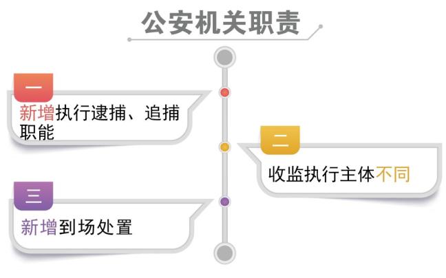 一是新增执行逮捕、追捕职能。《中华人民共和国社区矫正法》第47、50条规定“人民法院决定逮捕的,由公安机关执行”“被裁定撤销缓刑、假释和被决定收监执行的社区矫正对象逃跑的,由公安机关追捕”。二是收监执行主体不同。《社区矫正实施办法》第27条规定:对于撤缓撤假的对象,由司法行政机关负责移交,公安机关予以协助;《中华人民共和国社区矫正法》第48条规定:由公安机关负责移送。三是新增到场处置。《中华人民共和国社区矫正法》第31条规定:社区矫正对象正在实施违反监督管理规定的行为或者违反禁止令等违法行为的,制止无效的,通知公安机关到场处置。