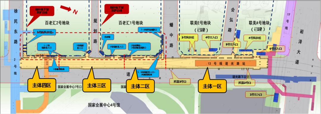 轨交13号线西延伸诸光路站坐落于虹桥主城副中心的核心地带,位于徐民东路与崧泽大道之间,沿诸光路呈南北走向。该站北端与17号线诸光路站实现通道换乘,南端与2号线徐泾东站形成T型节点换乘;是一座地下三层(局部五层)的岛式车站。