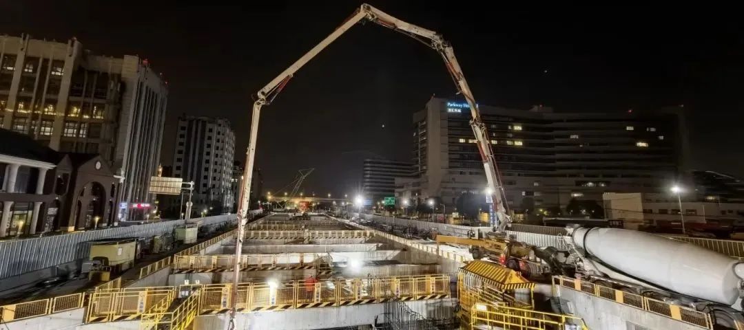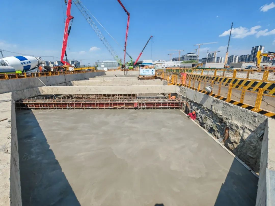 Ⅴ区位于芳乐路站北端,沿联友路南北向布置,主体结构为地下二层单柱双跨混凝土箱形结构,作为全线关键控制性工程,Ⅴ区承担着纪翟路始发盾构接收井的核心功能,其结构封顶标志着纪翟路站与芳乐路站连通已具备条件,为后续盾构区间推进奠定了坚实基础。