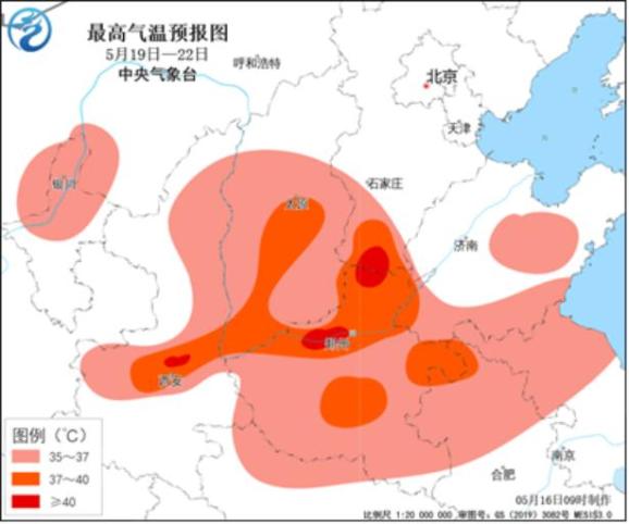 预计未来一周,华北、黄淮及陕西关中等地气温将持续升高,19日至22日,宁夏中北部、陕西中北部、河南、山东中南部、山西中南部、湖北北部等地将出现35℃以上的高温天气,其中山西南部、河南中北部、山东西部、陕西关中等地日最高气温可达37至40℃,局地超过40℃,上述部分地区最高气温将达到或超过历史同期最高气温极值。