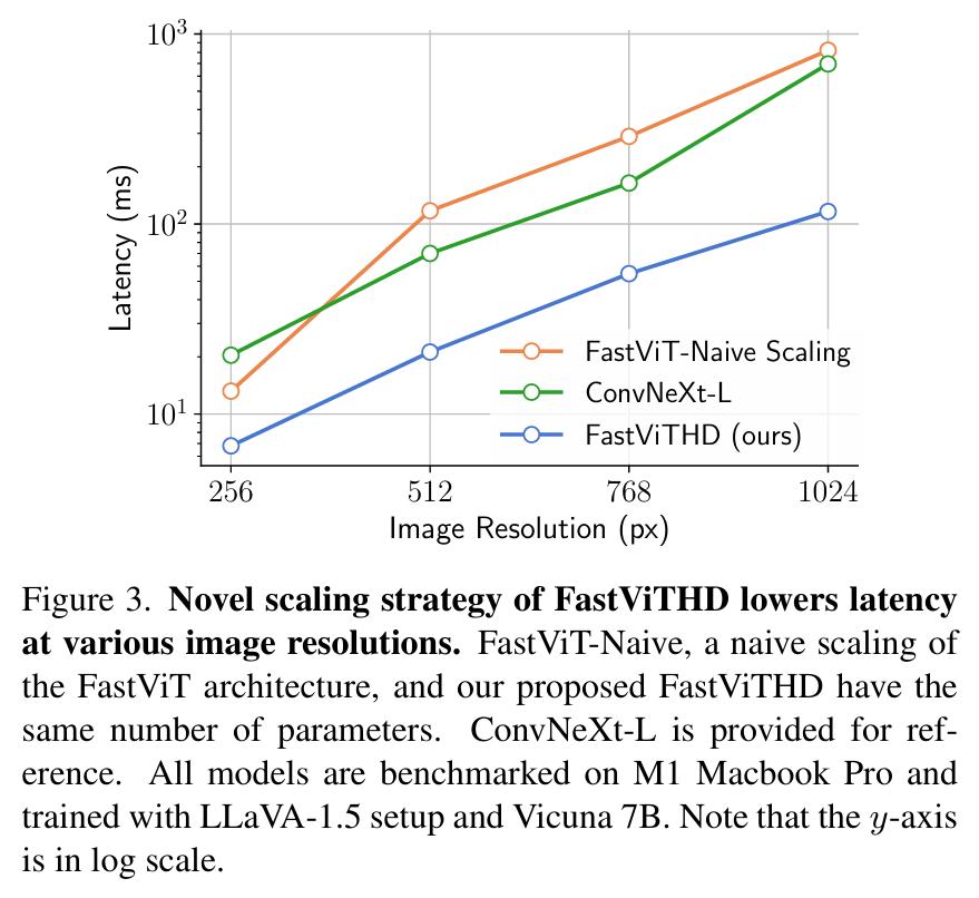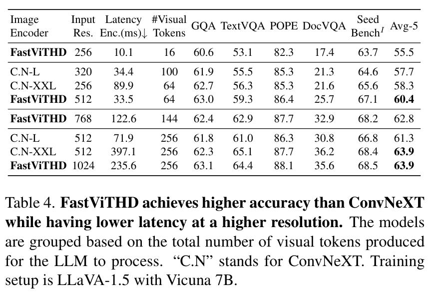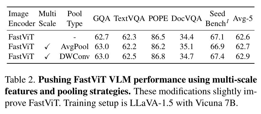 然而,正如表 1 所示,若仅在其 CLIP 预训练分辨率(256×256)下使用 FastViT,其 VLM 表现并不理想。