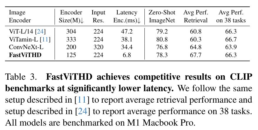 如表 3 所示,尽管 FastViT-HD 的参数量比 ViT-L/14 小 2.4 倍,且运行速度快 6.9 倍,但在 38 项多模态零样本任务中的平均表现相当。相比另一种专为 VLM 构造的混合模型 ViTamin,FastViT-HD 参数量小 2.7 倍,推理速度快 5.6 倍,检索性能更优。