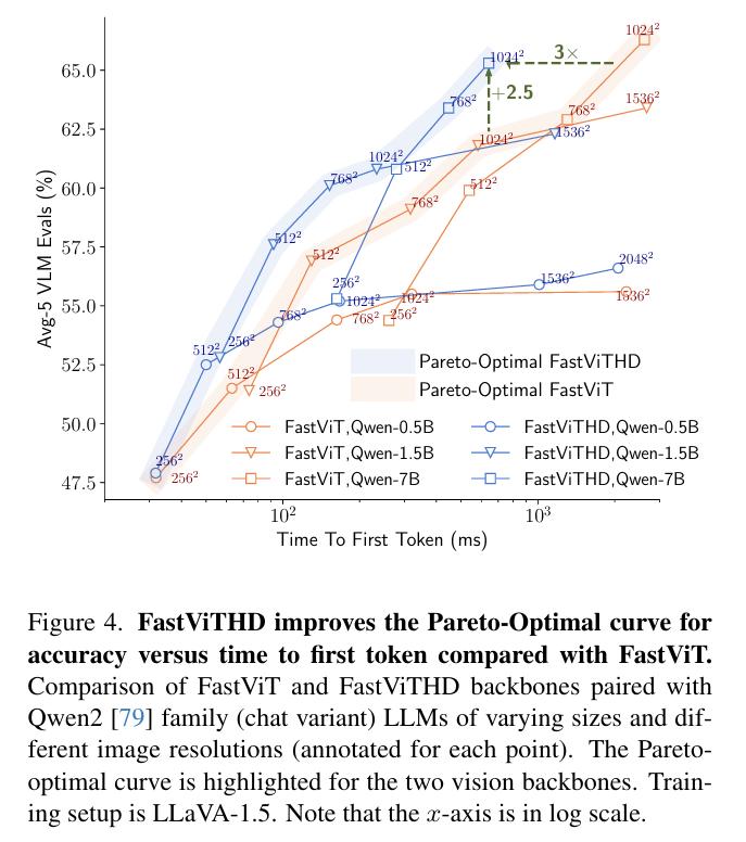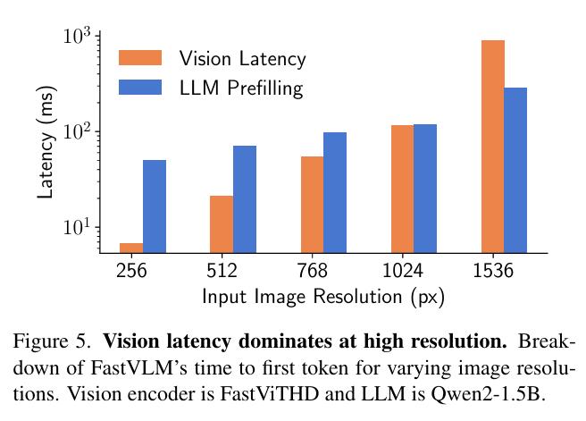 FastViT 的主要优势在于其图像分辨率缩放所具有的高效性 —— 相比采用 patch size 为 14 的 ViT 架构,其生成的 token 数量减少了 5.2 倍。这样的 token 大幅裁剪显著提升了 VLM 的运行效率,因为 Transformer 解码器的预填充时间和首个 token 的输出时间(time-to-first-token)大大降低。