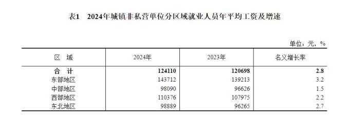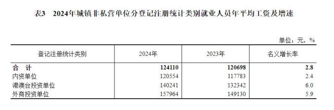 2024年,全国城镇非私营单位就业人员年平均工资124110元,比上年增加3412元,名义增长2.8%,按可比口径增长2.6%。