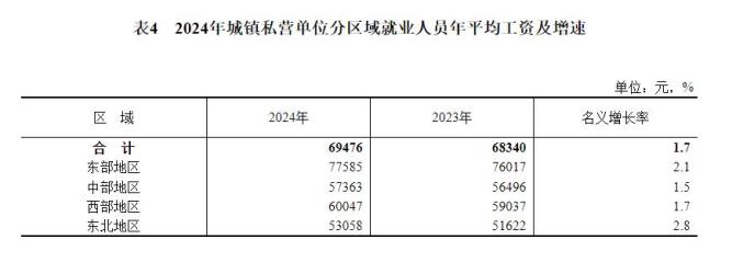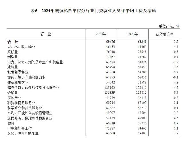 二、城镇私营单位就业人员年平均工资情况2024年,全国城镇私营单位就业人员年平均工资69476元,比上年增加1136元,名义增长1.7%,按可比口径增长4.0%。