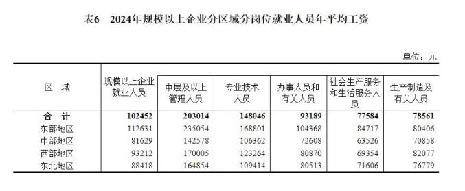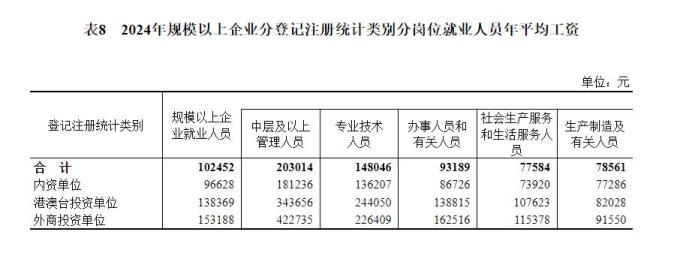 2024年全国城镇非私营单位和私营单位就业人员年平均工资分别为124110元和69476元;规模以上企业就业人员年平均工资为102452元,其中,中层及以上管理人员203014元,专业技术人员148046元,办事人员和有关人员93189元,社会生产服务和生活服务人员77584元,生产制造及有关人员78561元。