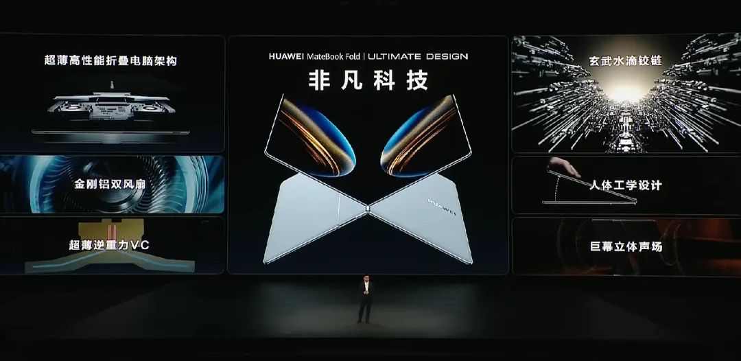 发布会上,华为18英寸的折叠屏电脑MateBook Fold非凡大师亮相。作为全球首款鸿蒙折叠电脑,该款电脑采用超轻薄折叠设计,18英寸大屏沉浸,13英寸小巧便携,展开薄至7.3mm,重量仅1.16kg。