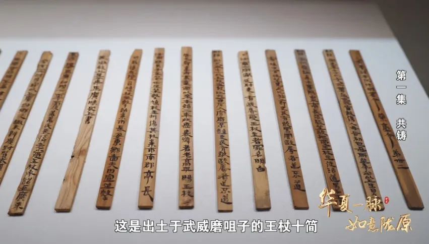 出土于武威磨咀子的王杖十简,内容分别为西汉皇帝颁布的关于“年七十受王杖”的两份诏书,是汉代诏令制度、尊老养老制度在河西走廊扎下根脉的证据,也是各民族共同开发大西北的重要标识。