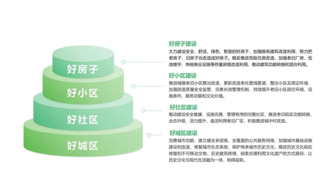 住房城乡建设部副部长 秦海翔秦海翔将其概括为“四好”建设,即:好房子建设,主要是大力建设安全、舒适、绿色、智慧的好房子,同时加强既有建筑改造利用,努力把老房子、旧房子也改造成好房子。稳妥推进危险住房改造,加强老旧厂房、低效楼宇、传统商业设施等存量房屋的改造利用,推动建筑功能转换和混合利用。好小区建设,主要是推进城镇老旧小区整治改造,更新改造老化管线管道,整治小区及周边的环境,加强改造的质量安全监管,完善长效的管理机制,来持续提升老旧小区居住环境、设施条件、服务功能和文化价值。好社区建设,主要是推动建设安全健康、设施完善、管理有序的完整社区,推进老旧街区功能转换、业态升级、活力提升,盘活利用老旧厂区,积极推进城中村改造。好城区建设,主要是完善城市功能,建立健全多层级、全覆盖的公共服务网络,加强城市基础设施的建设和改造,修复城市生态系统,保护传承城市历史文化,推进历史文化街区修复和不可移动文物、历史建筑修缮,探索合理利用文化遗产的方式路径,让历史文化与现代生活融为一体,相得益彰。