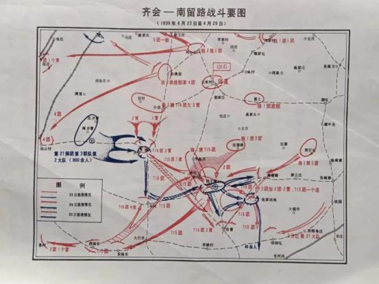 齐会-南留路战斗要图同时,我援军716团1、2营与715团7连陆续从东北、东南方向赶到,形成内外夹击之势。23日晚在夜色掩护下,八路军内外合击同时发起总攻,敌军腹背受敌,阵脚大乱。
