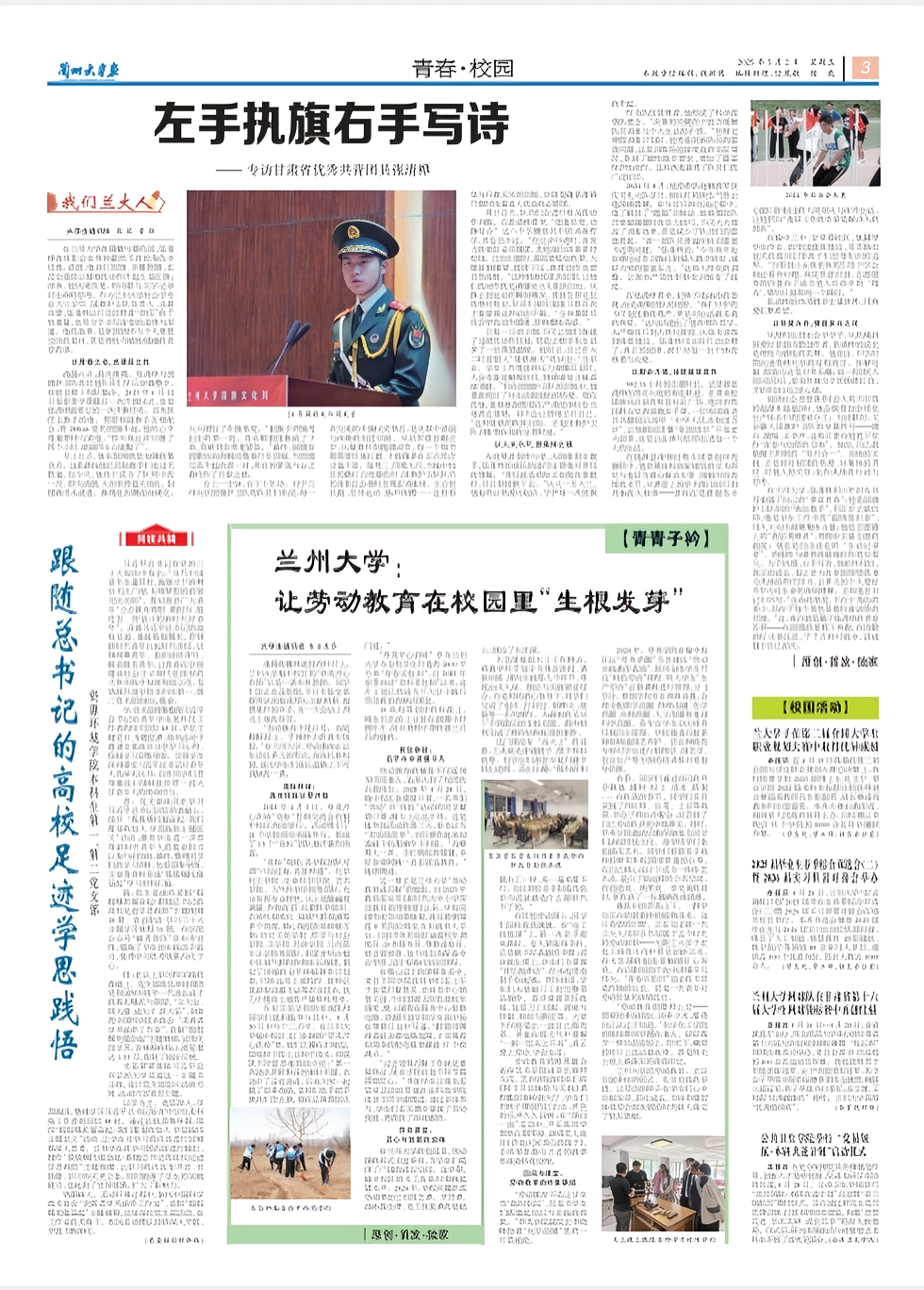 在兰州大学,张清桦用三年时光书写着属于自己的“多面青春”:他是国旗护卫队里的“铁血旗手”,用正步丈量信仰;他是学生工作中的“温情组织者”,用人文关怀凝聚集体力量;他是志愿路上的“基层观察者”,用脚步丈量志愿的温度;他也是自由游走的“生活记录者”,将理性与感性的碰撞化作笔尖星火。左手执旗,右手写诗,他始终相信,真正的成长,是让宏大的家国理想落地为具体的责任担当,让多元的个人爱好升华为对生命的深刻理解。正如他在日记中所写:“生命的厚度,不在于角色的多少,而在于每个角色里都住着滚烫的灵魂。”这,或许就是属于张清桦的青春答案———在国旗的星辉下奔跑,在诗歌的灯火里沉思,于千万种可能中,活成属于自己的光。