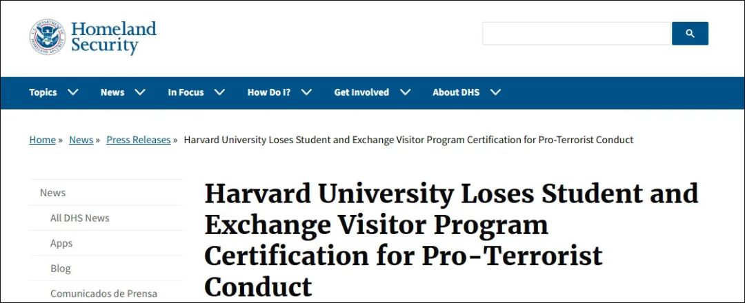 美国国土安全部网站发表声明,撤销哈佛大学SEVP认证。“学生和交流访问学者项目”由美国国土安全部下属机构管理,招收外国留学生和交流学者的美国学校均需获得相关资质。