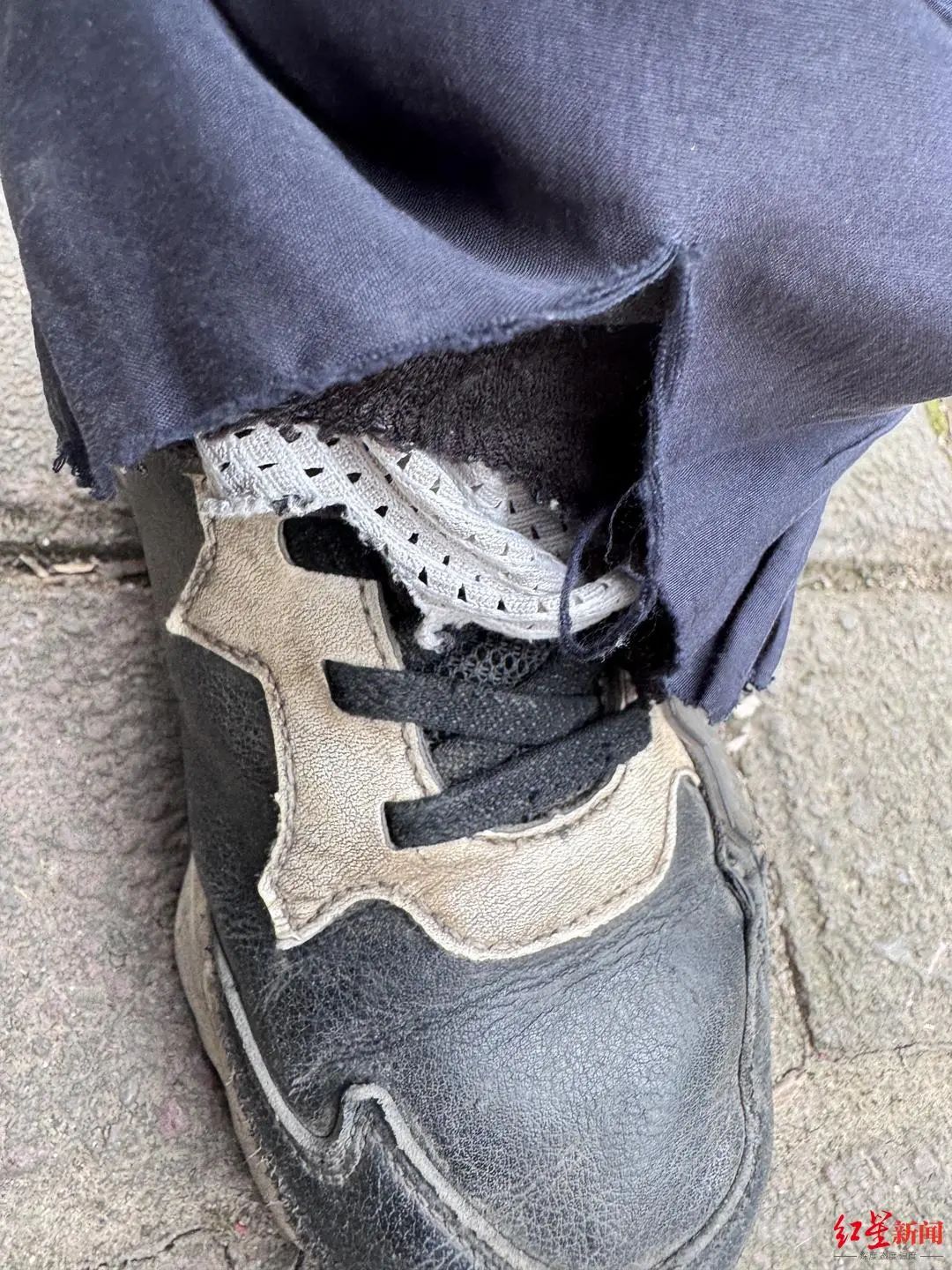 另外,学校反馈,赵平安床上用品单一陈旧,平时衣物也多有陈旧破损:每周仅带两件衣服,有时一件穿一周。5月13日,记者发现赵平安的裤子有破损,当季所穿运动裤竟有三层,鞋子有明显龟裂纹。对此,肖开兴解释:“衣服、鞋子,都是他自己找来穿的,家里衣服裤子多得很。”