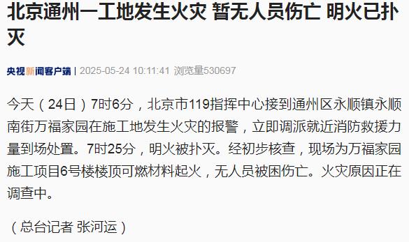 24日7时6分,北京市119指挥中心接到通州区永顺镇永顺南街万福家园在施工地发生火灾的报警,立即调派就近消防救援力量到场处置。7时25分,明火被扑灭。经初步核查,现场为万福家园施工项目6号楼楼顶可燃材料起火,无人员被困伤亡。火灾原因正在调查中。