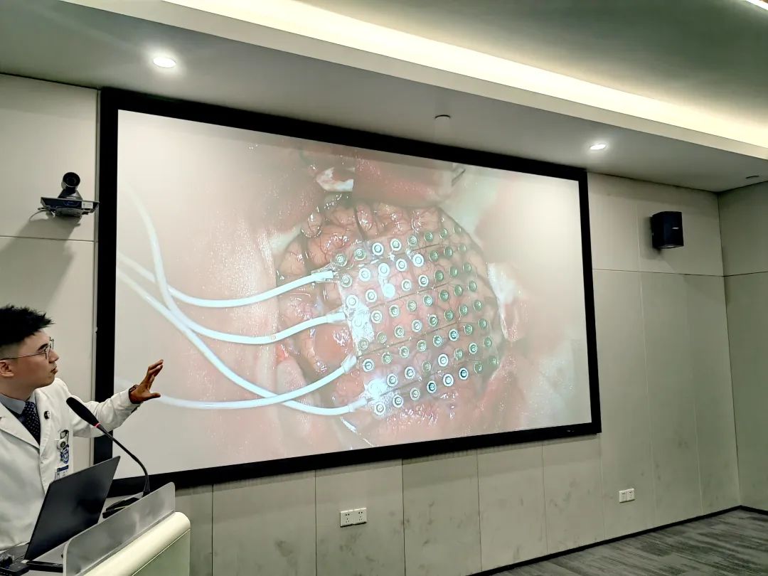 ▲杨渊介绍侵入式脑机接口而传统的判断方式,是医生通过影像学、超声、核磁共振等方式对肿瘤边界进行结构性的主观判断。而想要精确地划分脑部功能区,还需要在术中唤醒患者,对其脑部进行电刺激,这个过程无疑对患者来说是痛苦的,甚至很可能引发癫痫。