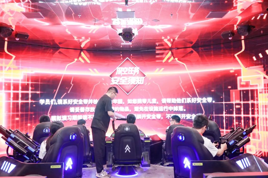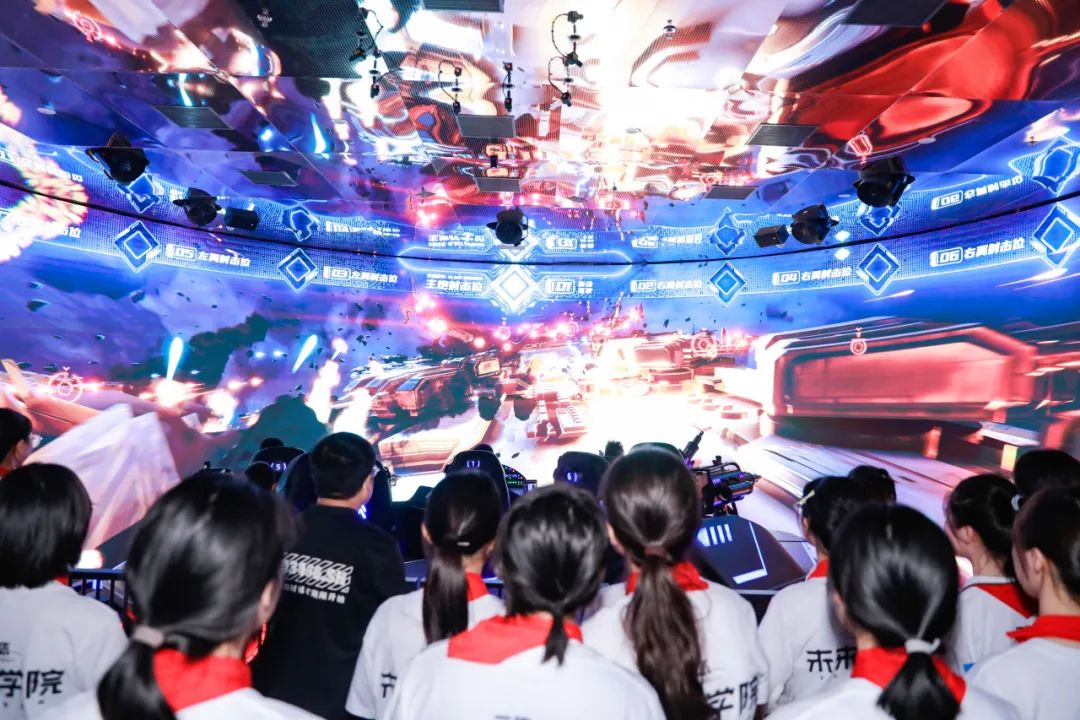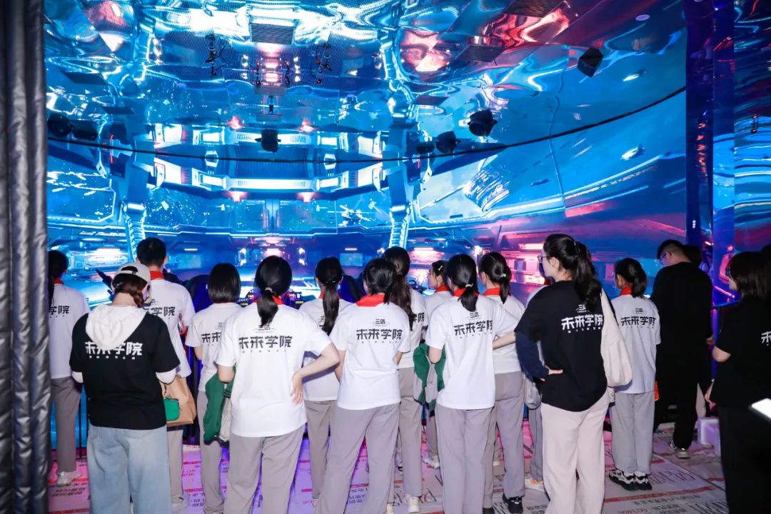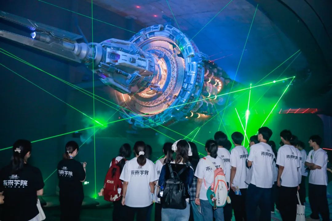 青少年们进入在水一方科幻馆,二楼“三体・未来学院”展区精彩纷呈,他们化身为学员,在“信念广场”聆听导师沉浸式情景演绎,深入了解三体世界观;“飞碟剧场”内升降舞台、威亚悬吊等技术手段巧妙结合,呈现出三体震撼场面;“自然选择号”战舰模型秀展示精妙结构设计与强大功能;球幕剧场的互动游戏考验团队协作,让青少年在挑战中感受科幻魅力。
