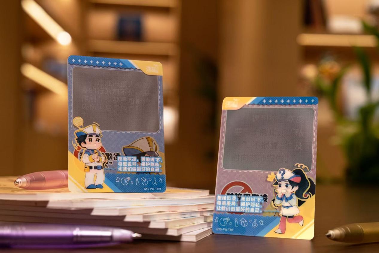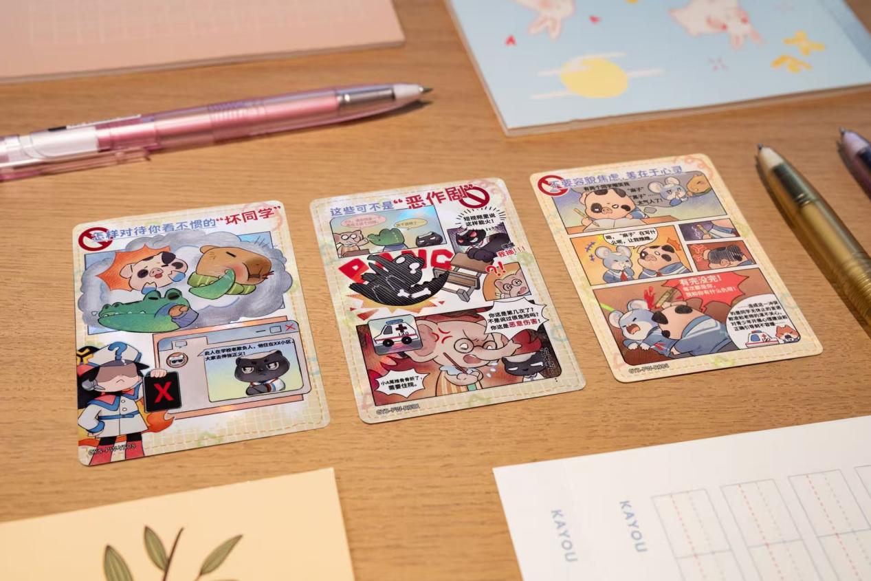配套卡牌则充分发挥卡游的原创美术设计优势,以温暖明快的色彩、拟人化小动物形象构建亲和化视觉体系,并创新性采用 “莫尔条纹解密卡” 。“解密卡”利用了“莫尔条纹现象”光学原理,将解密卡对应部分贴合图片,谜底提示或知识便会显现,让青少年在拆解谜题的过程中,潜移默化掌握欺凌识别技巧、沟通干预方法及自我保护技能。这种 “静态阅读 + 动态互动” 的组合模式,打破了传统说教式教育的壁垒,为校园法治教育注入创新活力。